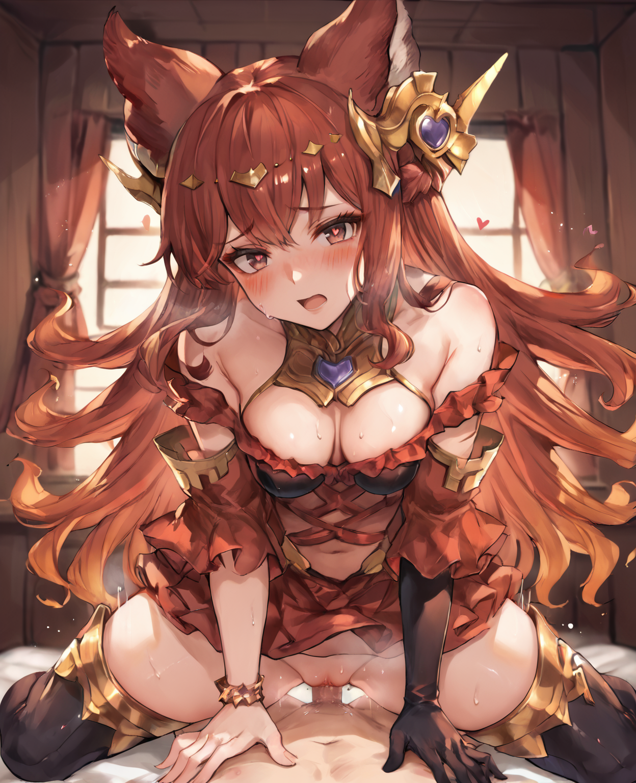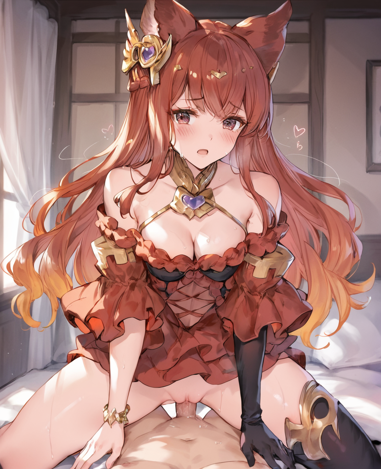 anthuria, 1girl, erune, solo, dress, animal ears, red dress, red hair, long hair, thighhighs, hair ornament, gloves, red eyes, single glove, black thighhighs, bare shoulders, bangs, black gloves, medium breasts, elbow gloves, jewelry, detached sleeves, short dress, cleavage,