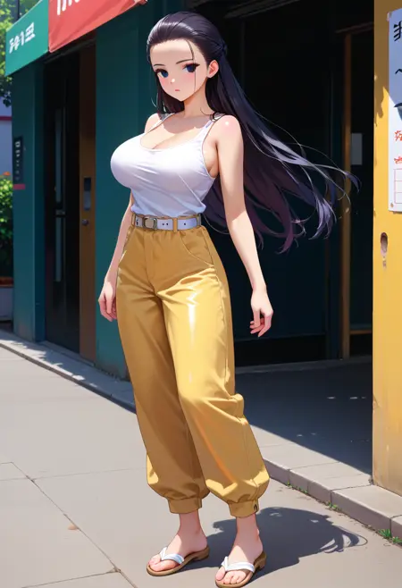 lora:super_oume_otane-03:0.9 黒い目、白いタンクトップ、後ろに流した髪、黒髪、非常に長い髪、ストレートヘア、[サンダル:0.5]、白いベルト、黄色のズボン、