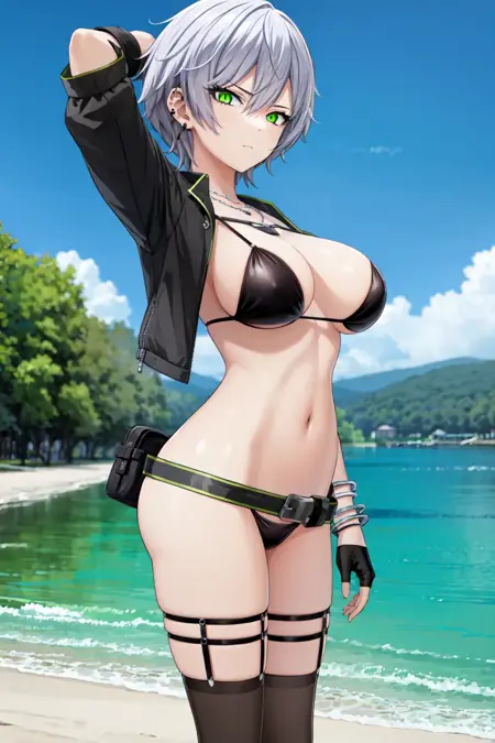 black bikini, cropped jacket, long sleeves, bracelet, belt pouch, chest harness, fingerless gloves, o-ring thigh strap, gray thighhighs, a qua pendant, cleavage, black footwear
