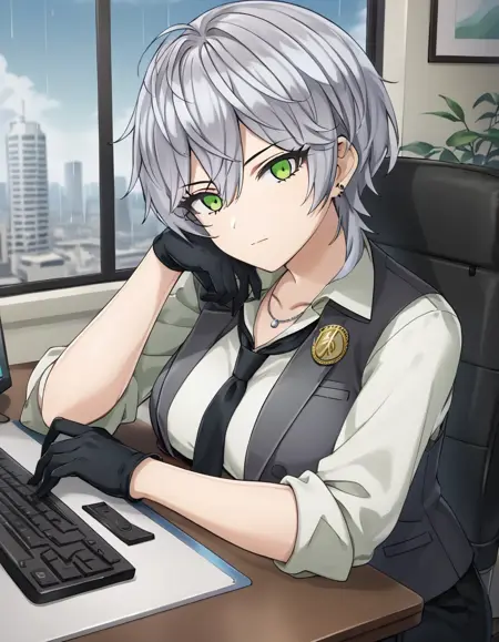 collared shirt, black necktie, silver necklace, sleeves rolled up, gray vest, collarbone, badge, black gloves, black pants, double-breasted, black high heels