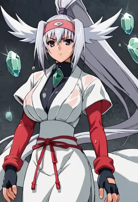 lora:akidra-Noob:1 akidra, purple eyes, high ponytail, no pants, thigh boots, white boots, long skirt, white skirt, white japanese clothes, red rope, hairband,headband,head wings, gem, blue and grey and white hair, black tight shirt, white sash, white kimono with short sleeves, long sleeves, red sleeves,black fingerless gloves