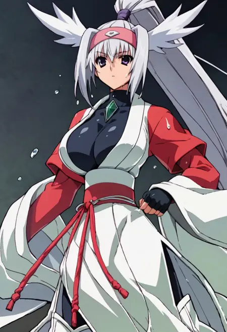 lora:akidra-Noob:1 akidra, 보라색 눈, 높은 플랫테일, 바지 없음, 허벅지 부츠, 흰색 부츠, 긴 치마, 흰색 치마, 흰색 일본 복장, 빨간 밧줄, 헤어밴드, 헤드밴드, 머리 날개, 보석, 파랑과 회색과 흰색 머리카락, 검은 피트한 셔츠, 흰색 띠, 짧은 소매가 있는 흰색 김ono, 긴 소매, 빨간 소매, 검은 손가락 없는 장갑
