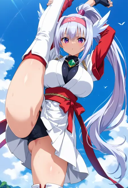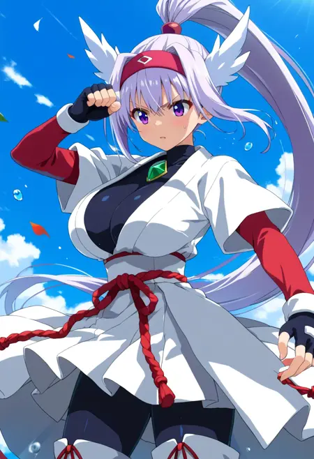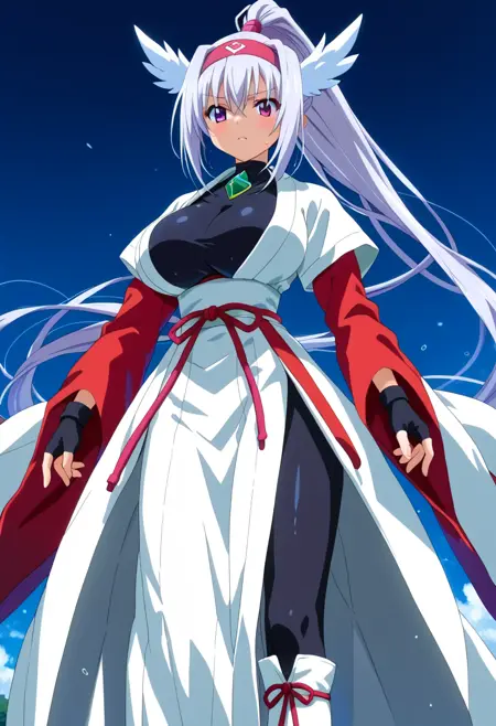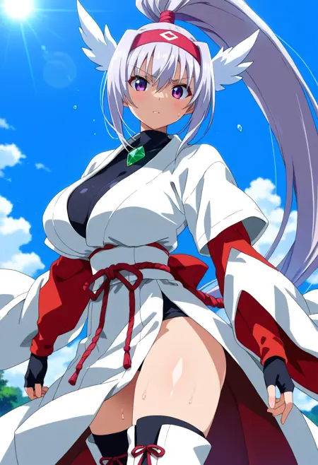 lora:akidra-Noob:1 akidra, purple eyes, high ponytail, no pants, thigh boots, white boots, long skirt, white skirt, white japanese clothes, red rope, hairband,headband,head wings, gem, blue and grey and white hair, black tight shirt, white sash, white kimono with short sleeves, long sleeves, red sleeves,black fingerless gloves