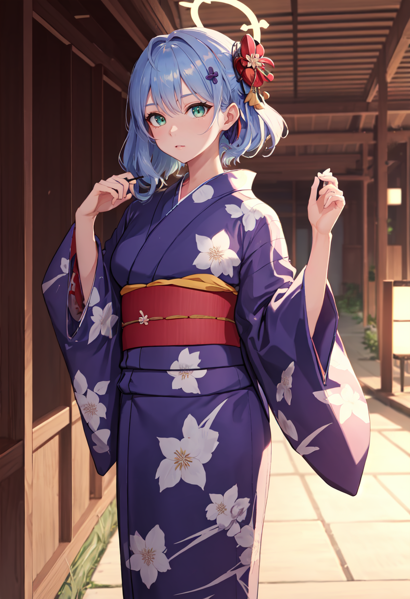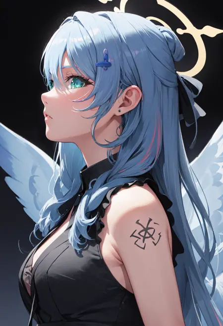 The trigger word is mine_bluearchive, and the pruned tags are blue_hair, long_hair, halo, green_eyes, pointy_ears, braid, hat, wings, hair_ornament, breasts, nurse_cap, blue_wings, large_breasts, twin_braids, ribbon, pink_bow, bow, feathered_wings, multicolored_hair, pink_ribbon, pink_hair. When some features (e.g. hair color) are not so stable at some times, you can add these them into your prompt.