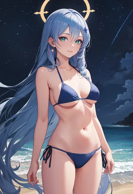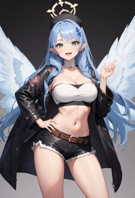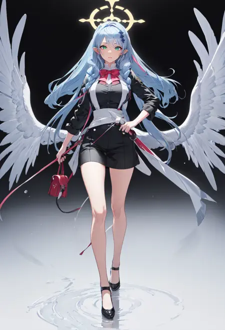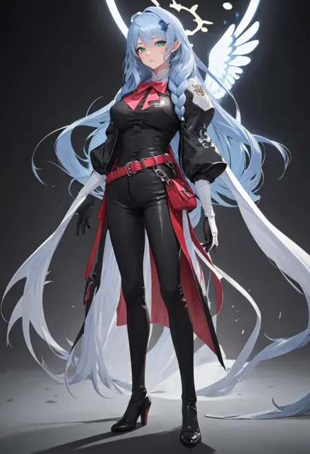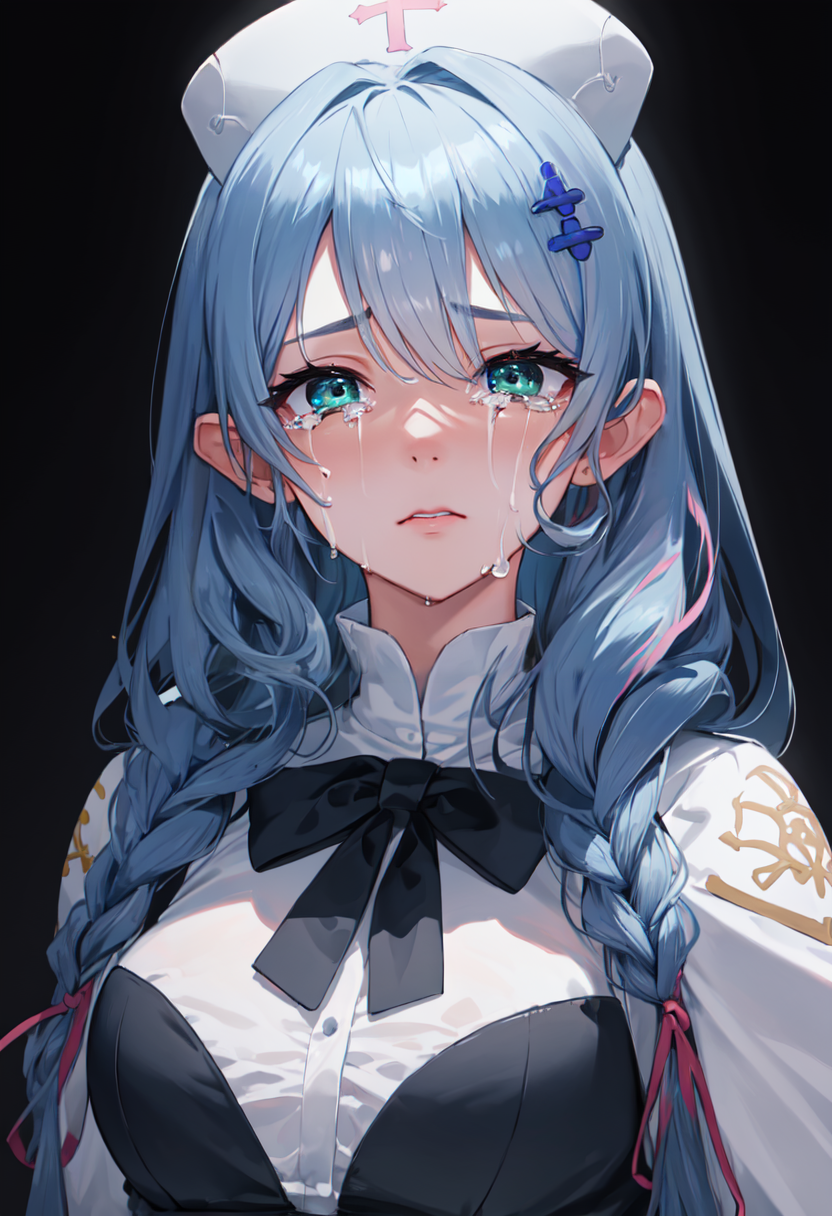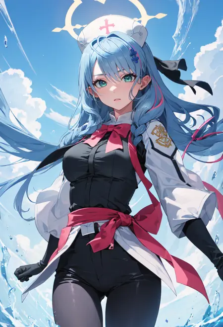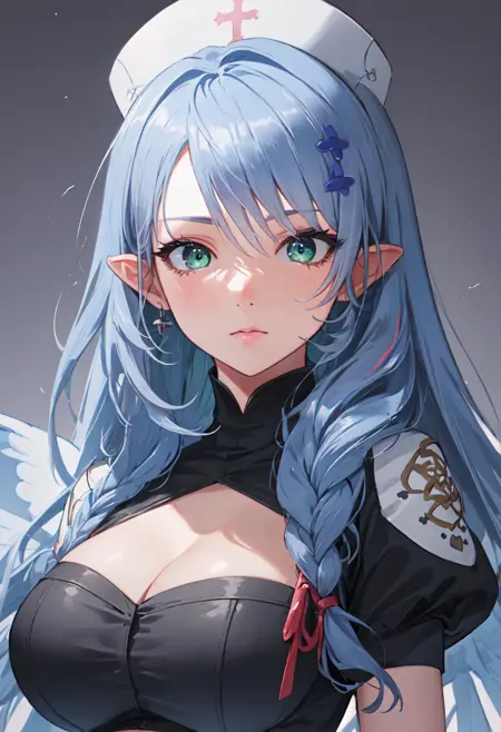 - The pruned character tags are blue hair, long hair, halo, green eyes, pointy ears, braid, hat, wings, hair ornament, breasts, nurse cap, blue wings, large breasts, twin braids, ribbon, pink bow, bow, feathered wings, multicolored hair, pink ribbon, pink hair. You can add them into prompts when core features (e.g. hair color) of character is not so stable.