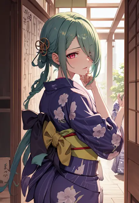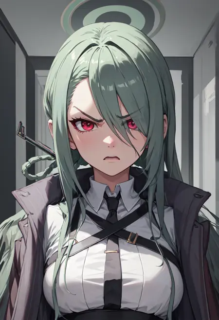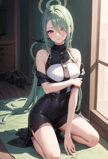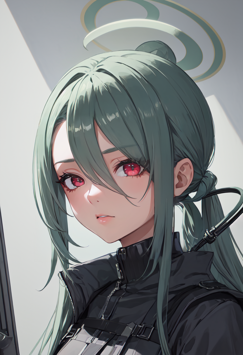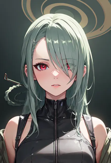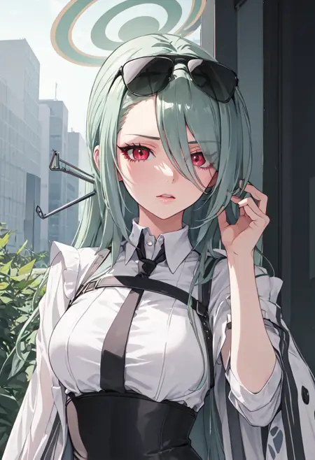 - The pruned character tags are long hair, breasts, halo, sunglasses, green hair, hair over one eye, eyewear on head, red eyes, hair ornament, large breasts, hair rings. You can add them into prompts when core features (e.g. hair color) of character is not so stable.