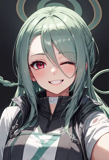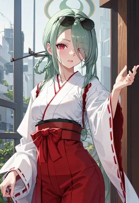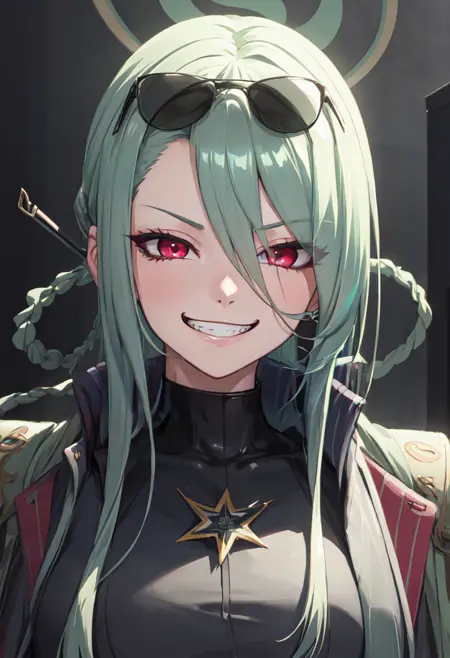 The trigger word is mina_bluearchive, and the pruned tags are long_hair, breasts, halo, sunglasses, green_hair, hair_over_one_eye, eyewear_on_head, red_eyes, hair_ornament, large_breasts, hair_rings. When some features (e.g. hair color) are not so stable at some times, you can add these them into your prompt.