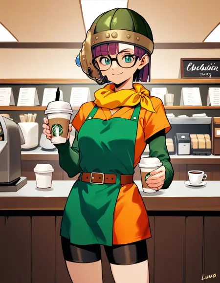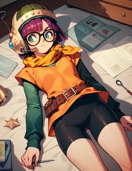 lucca: lucca, glasses, scarf, helmet, belt, orange shirt, green sleeves, short over long sleeves, bike shorts