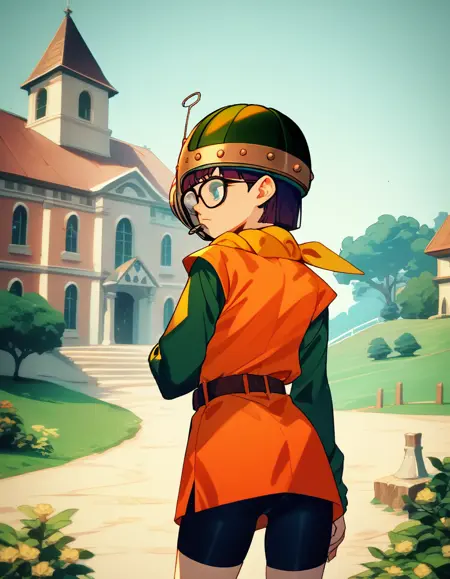 lucca: lucca, めがね、スカーフ、ヘルメット、ベルト、オレンジのシャツ、緑の袖、短い袖の上に長い袖、自転車用ショートパンツ