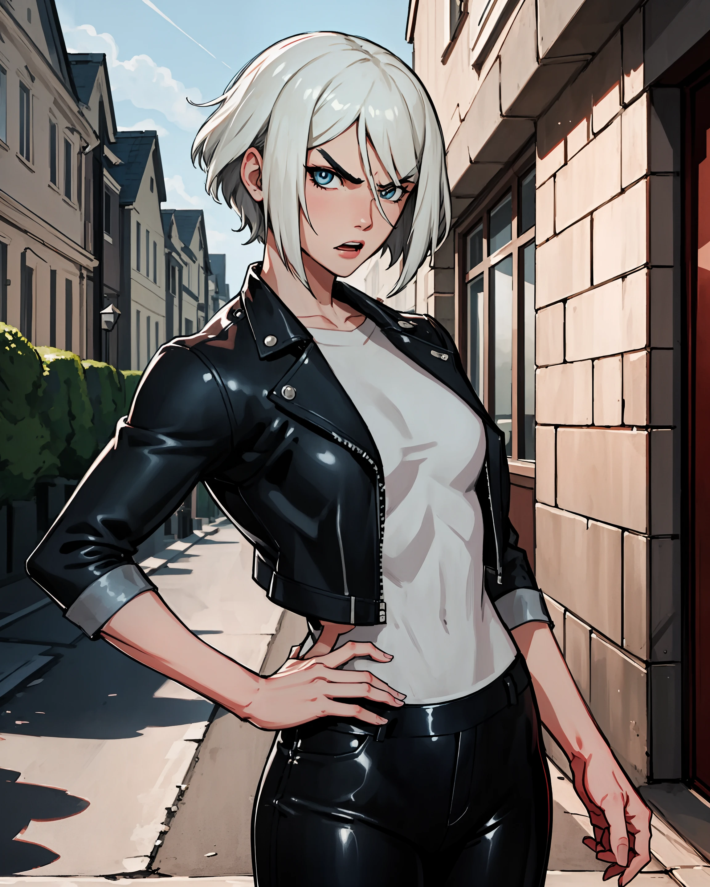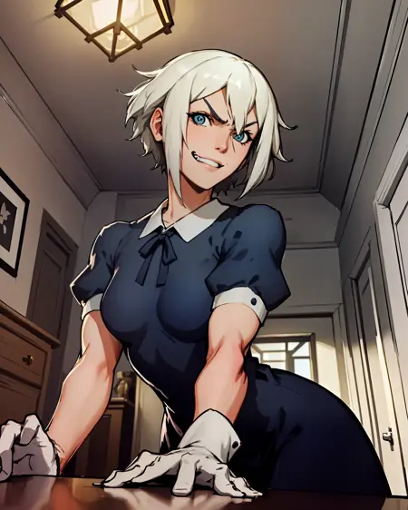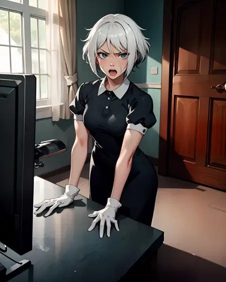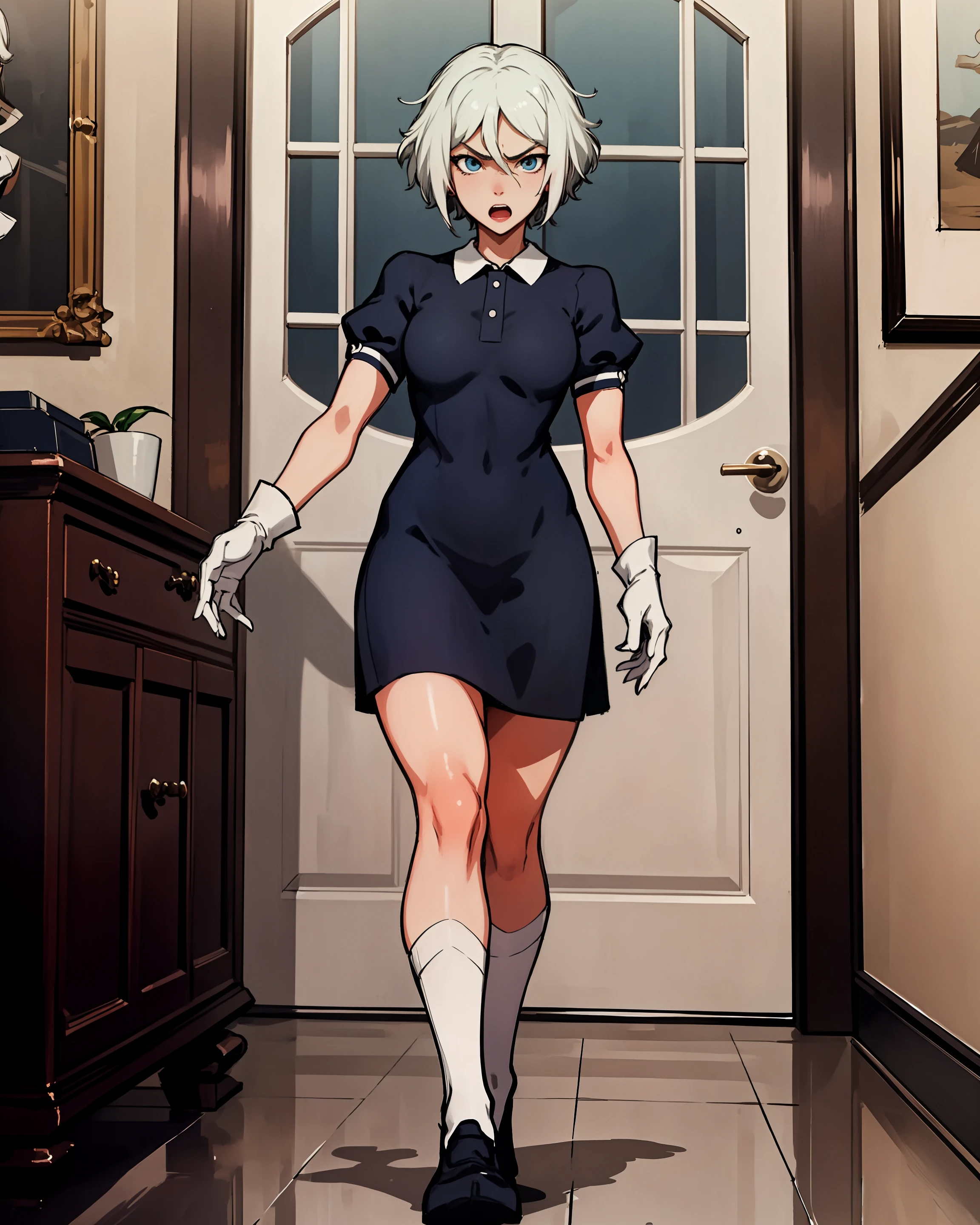 Outfit: white gloves, black dress, short sleeves, puffy sleeves