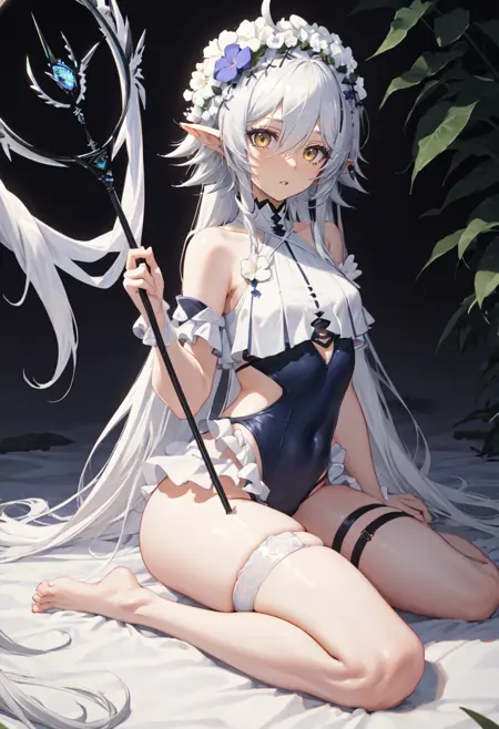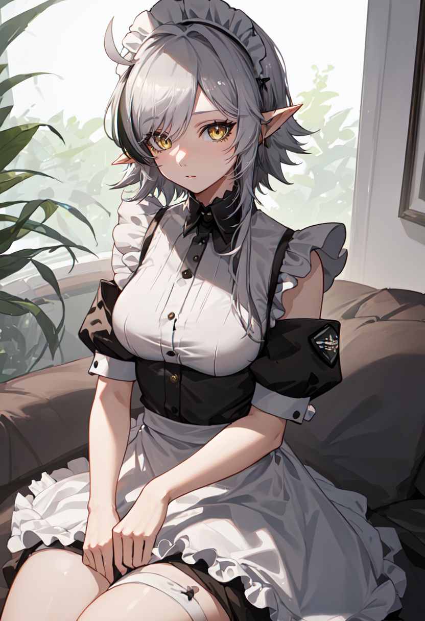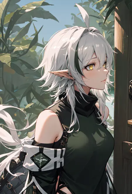 The trigger word is tomimi_arknights, and the pruned tags are pointy_ears, crocodilian_tail, tail, ahoge, yellow_eyes, grey_hair, long_hair, large_tail, breasts, streaked_hair, multicolored_hair. When some features (e.g. hair color) are not so stable at some times, you can add these them into your prompt.