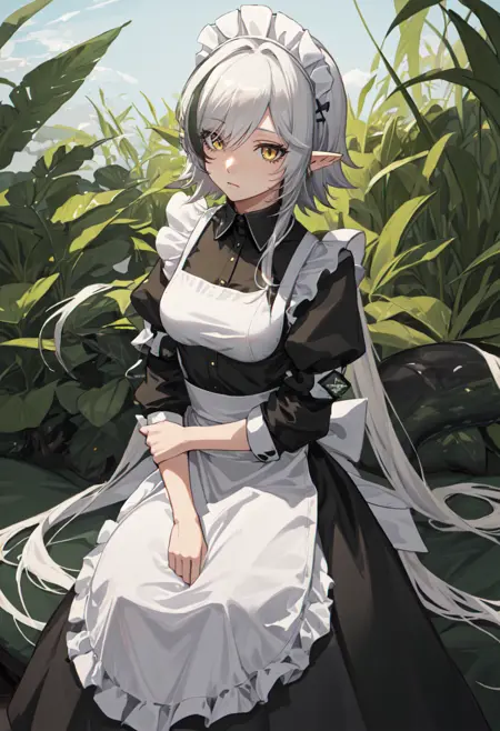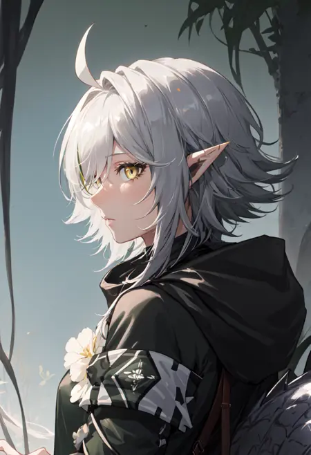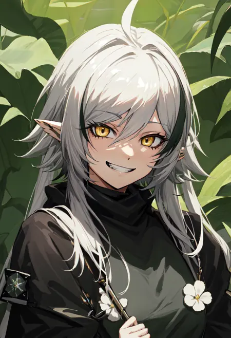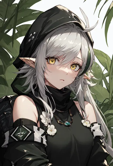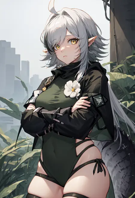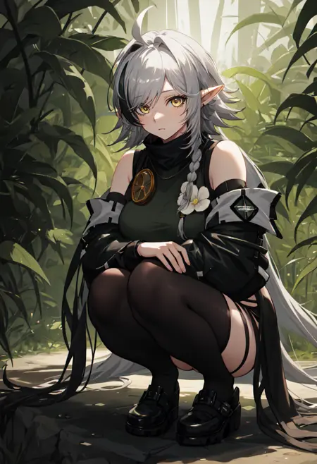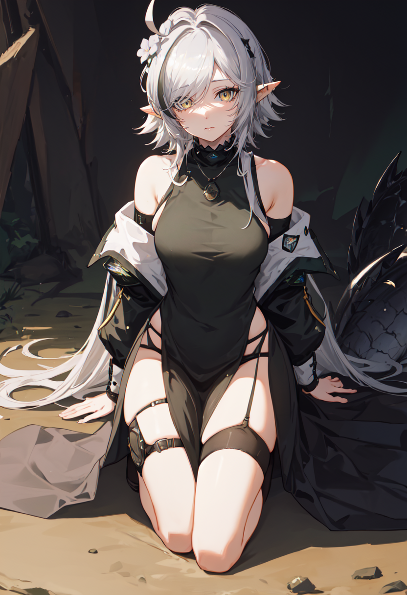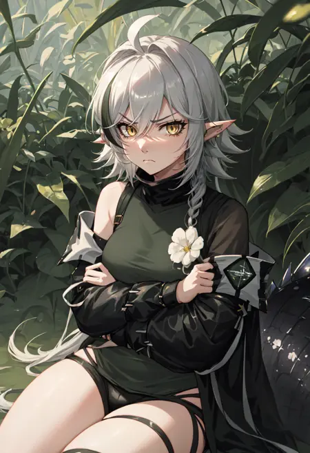 - The pruned character tags are pointy ears, crocodilian tail, tail, ahoge, yellow eyes, grey hair, long hair, large tail, breasts, streaked hair, multicolored hair. You can add them into prompts when core features (e.g. hair color) of character is not so stable.
