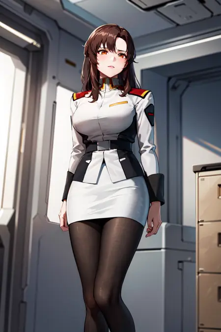 ramius1, 1girl, solo, (black_pantyhose:1.1), military uniform, military, makeup, white shirt, white skirt, tight skirt