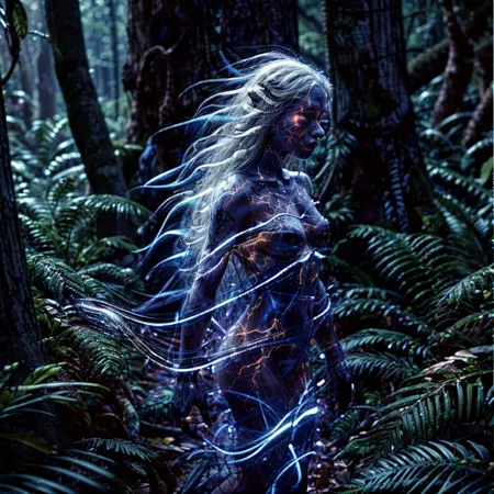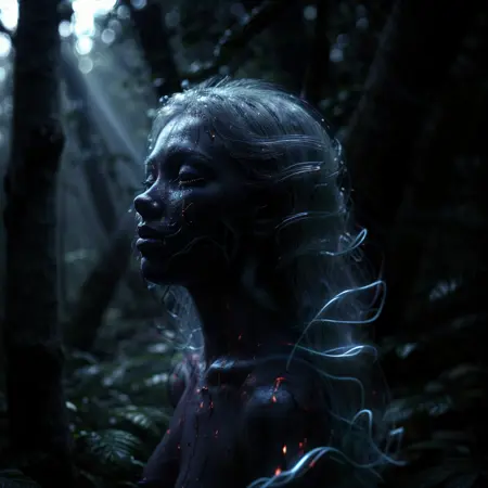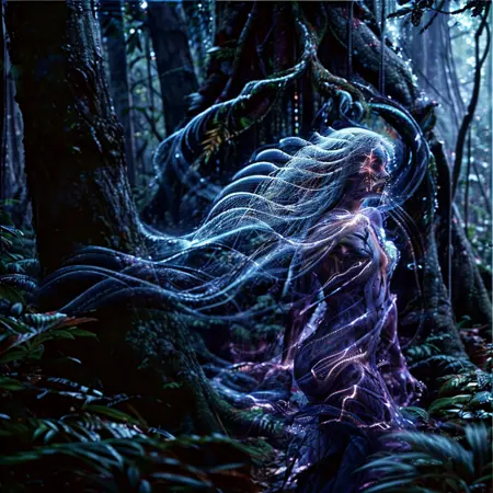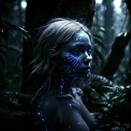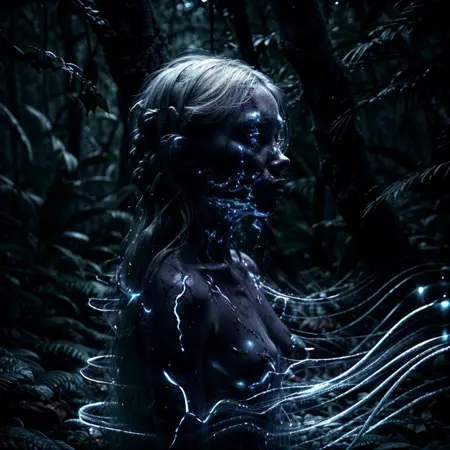 1girl, absurdly long hair, bare shoulders, barefoot, blue eyes, blue skin, blue theme, blurry, blurry background, braid, breasts, closed eyes, closed mouth, colored skin, dark, depth of field, dress, floating hair, from behind, from side, glowing, glowing eyes, lips, long hair, looking at viewer, looking up, navel, nipples, no humans, nude, ponytail, portrait, profile, ripples, see-through, silhouette, solo, sound waves, sound-of-anzhu, standing, transparent, tree, upper body, very long hair, walking, yellow eyes,
