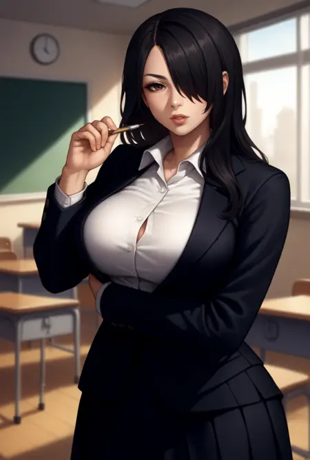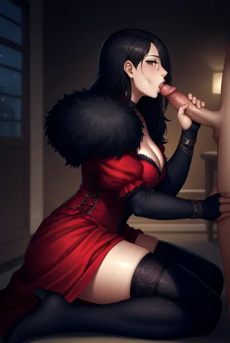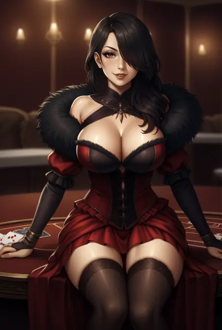 Outfit: ["brown eyes, black hair, long hair, hair over one eye, red dress, jewelry, corset, fur trim, bridal gauntlets, thighhighs, lips, makeup"]