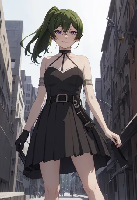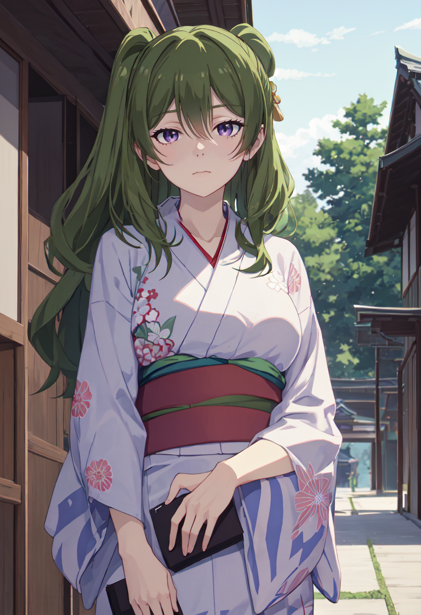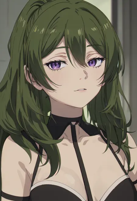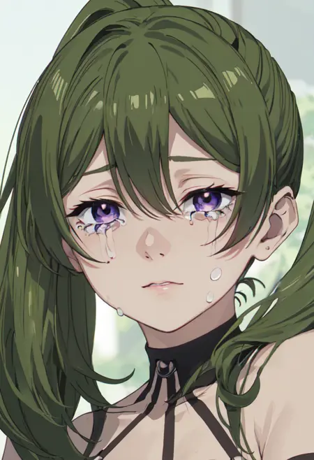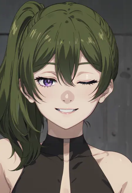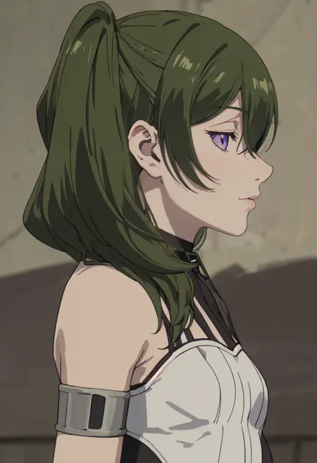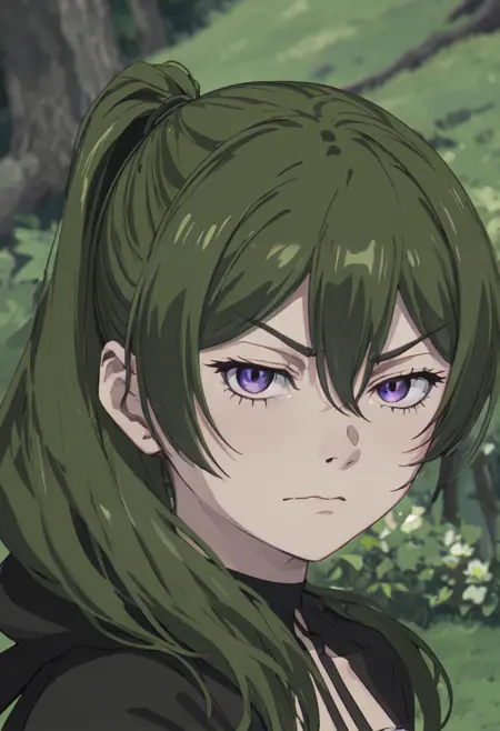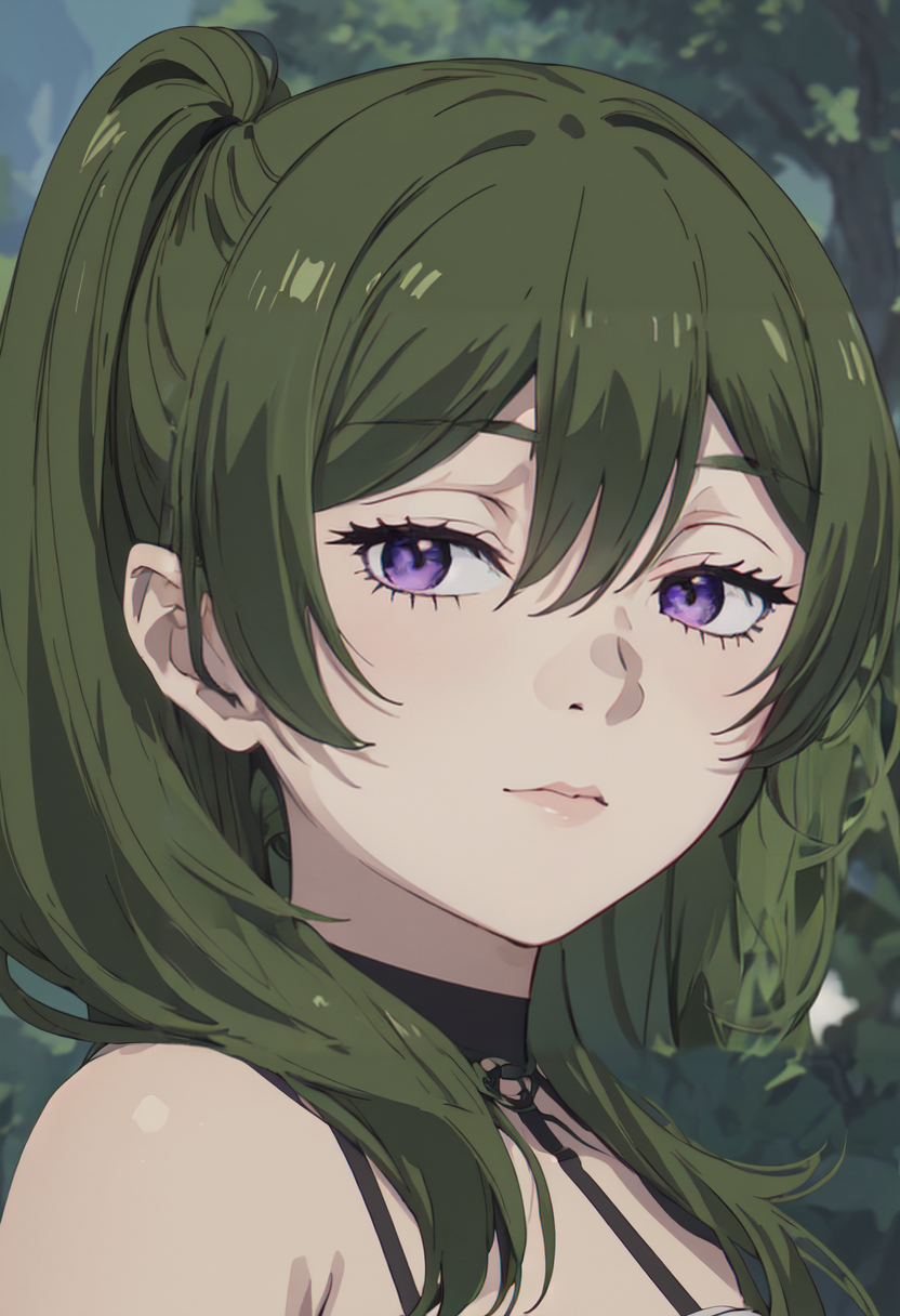 • The pruned character tags are green hair, long hair, hair between eyes, purple eyes, side ponytail, breasts, ponytail. You can add them into prompts when core features (e.g. hair color) of character is not so stable.