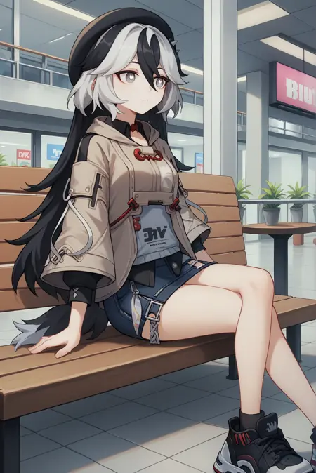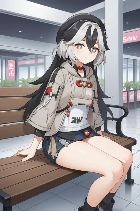 Default Outfit: jacket, miniskirt, denim skirt, sneakers, black beret, sneakers