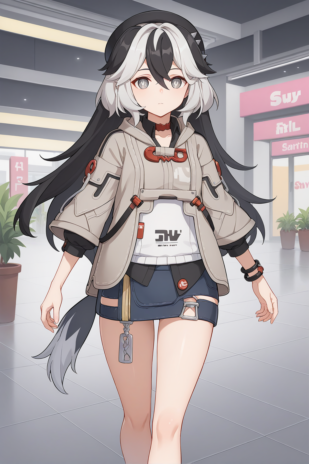 Appearance: two-tone hair, white hair, black hair, long hair, medium breasts, tail, animal ears, grey eyes