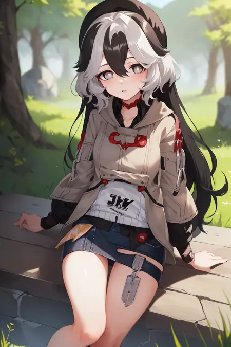 Default Outfit: jacket, miniskirt, denim skirt, sneakers, black beret, sneakers