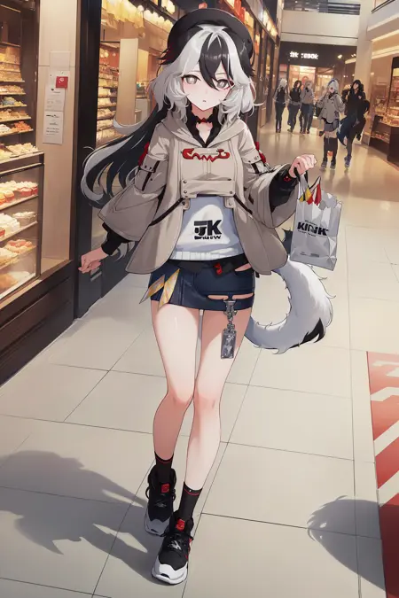 Appearance: two-tone hair, white hair, black hair, long hair, medium breasts, tail, animal ears, grey eyes