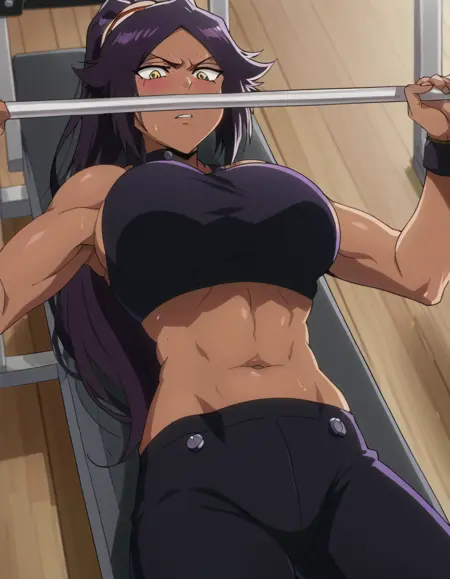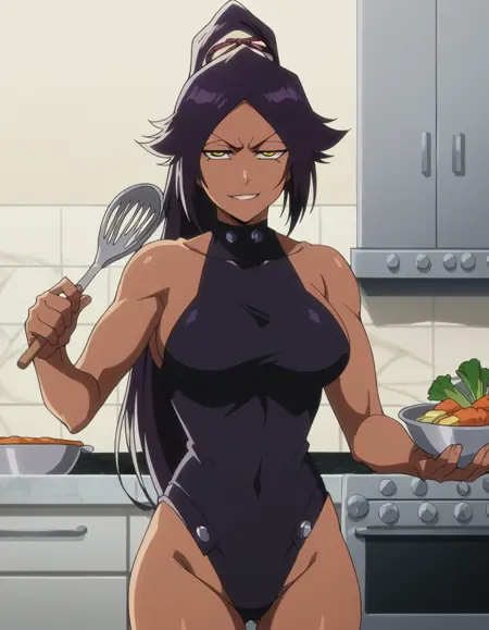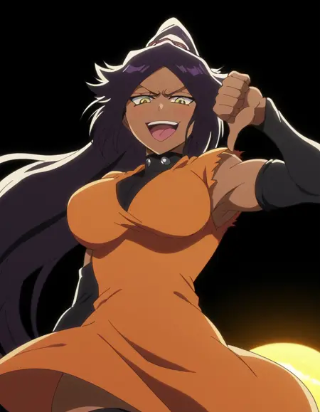 yoruichi shihouin, long hair, yellow eyes, ponytail, purple hair, dark skin, dark-skinned female,