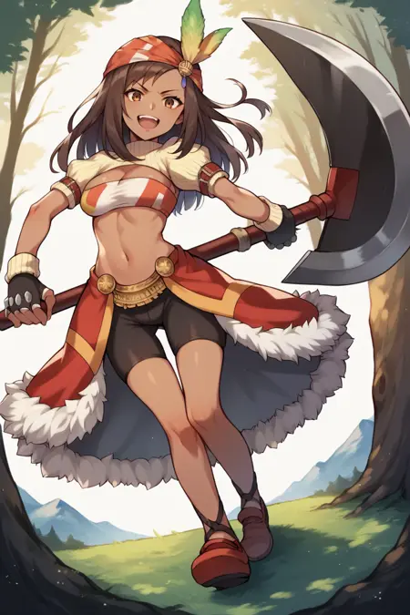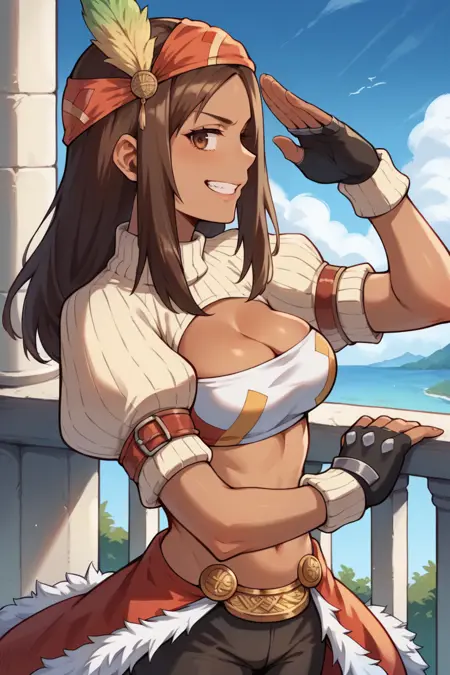 Add "bandana, feather hair ornament, turtleneck, cleavage, puffy sleeves, bandeau, red overskirt, fur trim, short shorts, fingerless gloves" for her typical look.