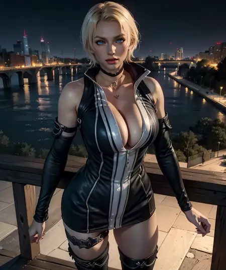 black dress, choker, detached sleeves, or asymmetrical gloves, or single elbow sleeve, thigh strap,