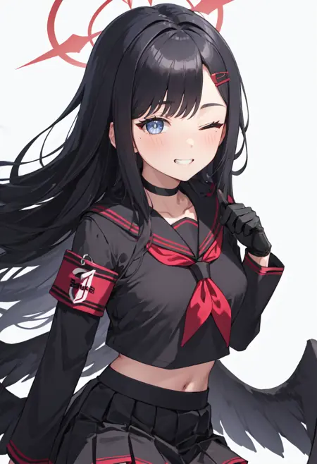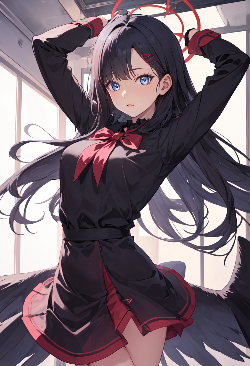 The trigger word is ichika_bluearchive, and the pruned tags are black_hair, long_hair, halo, hair_ornament, hairclip, red_halo, wings, black_wings, low_wings, feathered_wings, breasts. When some features (e.g. hair color) are not so stable at some times, you can add these them into your prompt.
