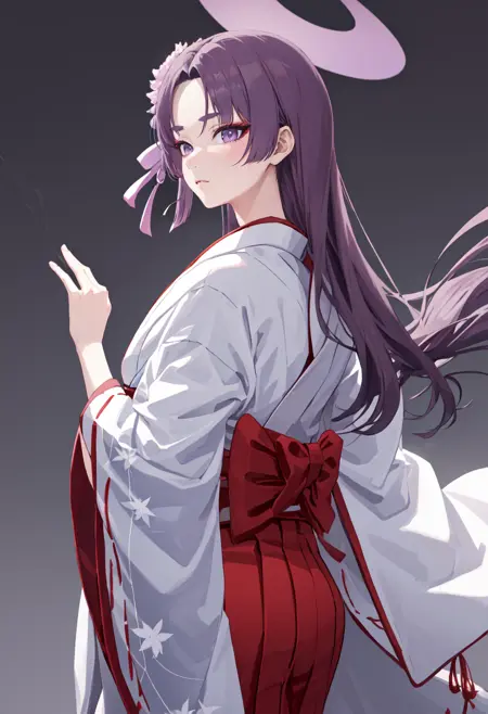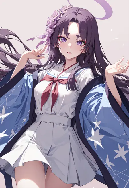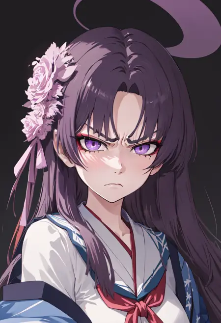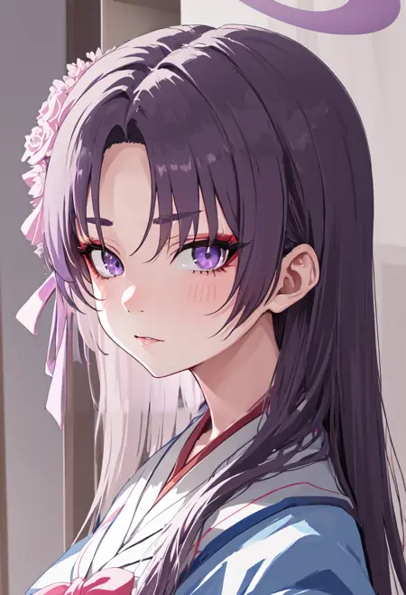 触发词为 yukari_bluearchive,精简标签为 long_hair, purple_hair, halo, purple_halo, hair_ornament, hair_flower, purple_eyes, eyeshadow, red_eyeshadow, breasts, fang, skin_fang, large_breasts。当某些特征(如发色)有时不稳定时,您可将这些标签添加到提示词中。