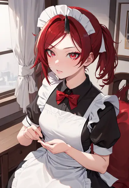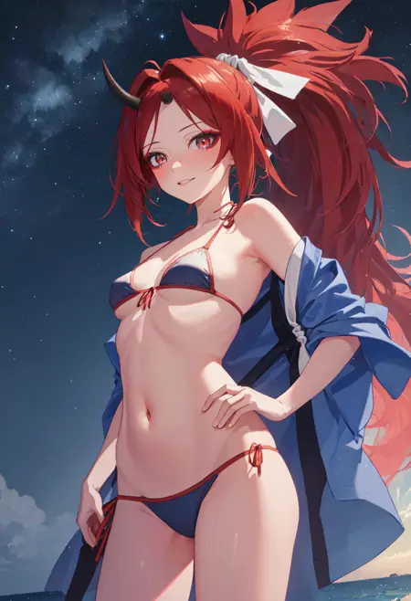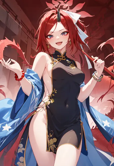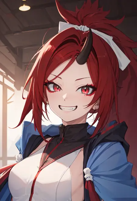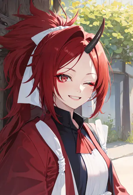- The pruned character tags are horns, long hair, red hair, single horn, halo, black horns, ponytail, red eyes, breasts, small breasts, tail, dragon tail, red eyeshadow, eyeshadow, red halo, red tail. You can add them into prompts when core features (e.g. hair color) of character is not so stable.