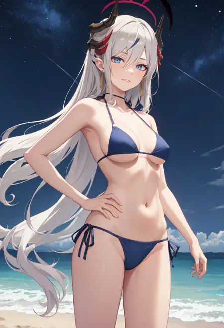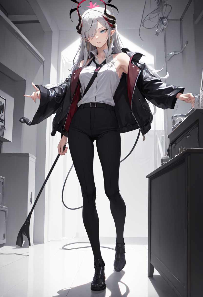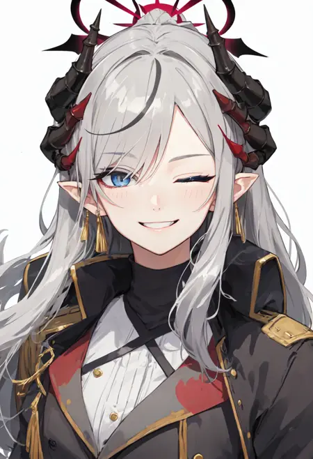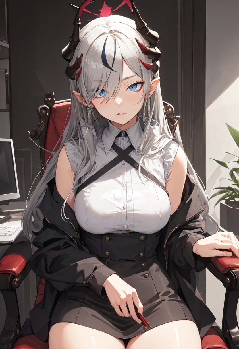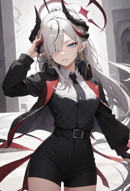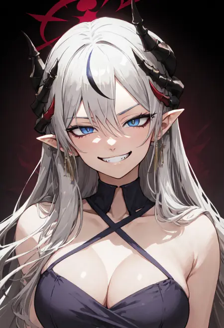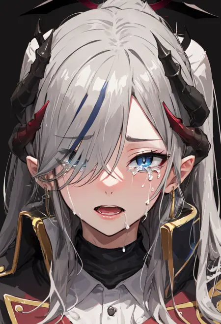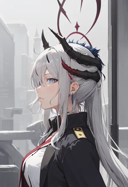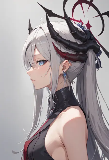 • The pruned character tags are horns, long hair, grey hair, demon horns, black horns, halo, multiple horns, pointy ears, breasts, hair over one eye, grey eyes, large breasts, blue eyes, hat, earrings, peaked cap, very long hair, red halo. You can add them into prompts when core features (e.g. hair color) of character is not so stable.