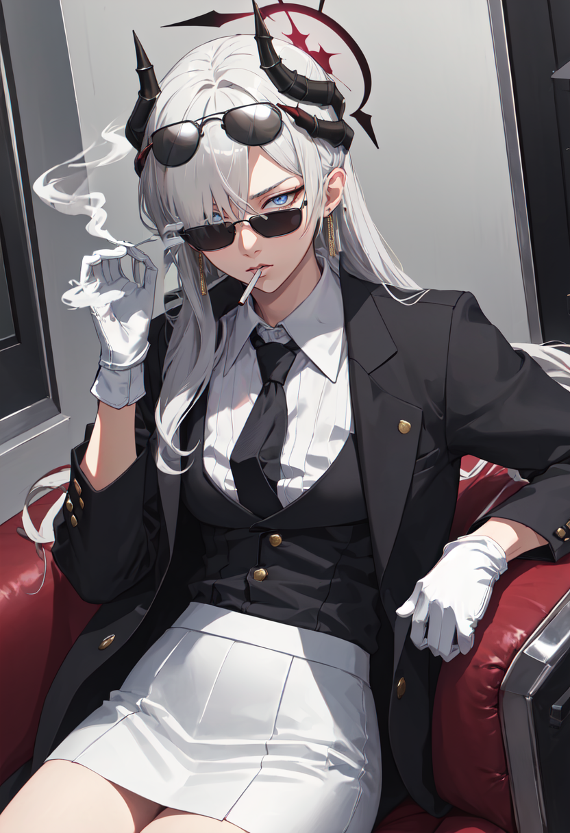 The trigger word is makoto_bluearchive, and the pruned tags are horns, long_hair, grey_hair, demon_horns, black_horns, halo, multiple_horns, pointy_ears, breasts, hair_over_one_eye, grey_eyes, large_breasts, blue_eyes, hat, earrings, peaked_cap, very_long_hair, red_halo. When some features (e.g. hair color) are not so stable at some times, you can add these them into your prompt.