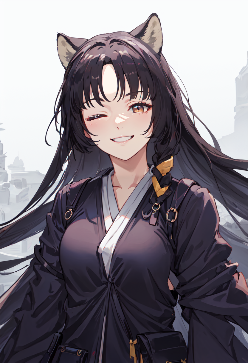 • The pruned character tags are black hair, dog ears, animal ears, long hair, facial mark, parted bangs, very long hair, brown eyes, dog girl. You can add them into prompts when core features (e.g. hair color) of character is not so stable.