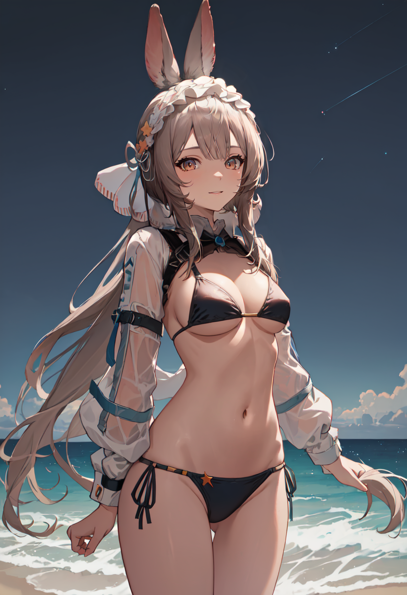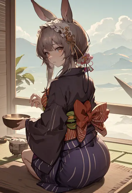 - The pruned character tags are animal ears, long hair, rabbit ears, brown hair, twintails, very long hair, brown eyes, hair ornament, hairband, bow, grey hair, low twintails, rabbit girl. You can add them into prompts when core features (e.g. hair color) of character is not so stable.