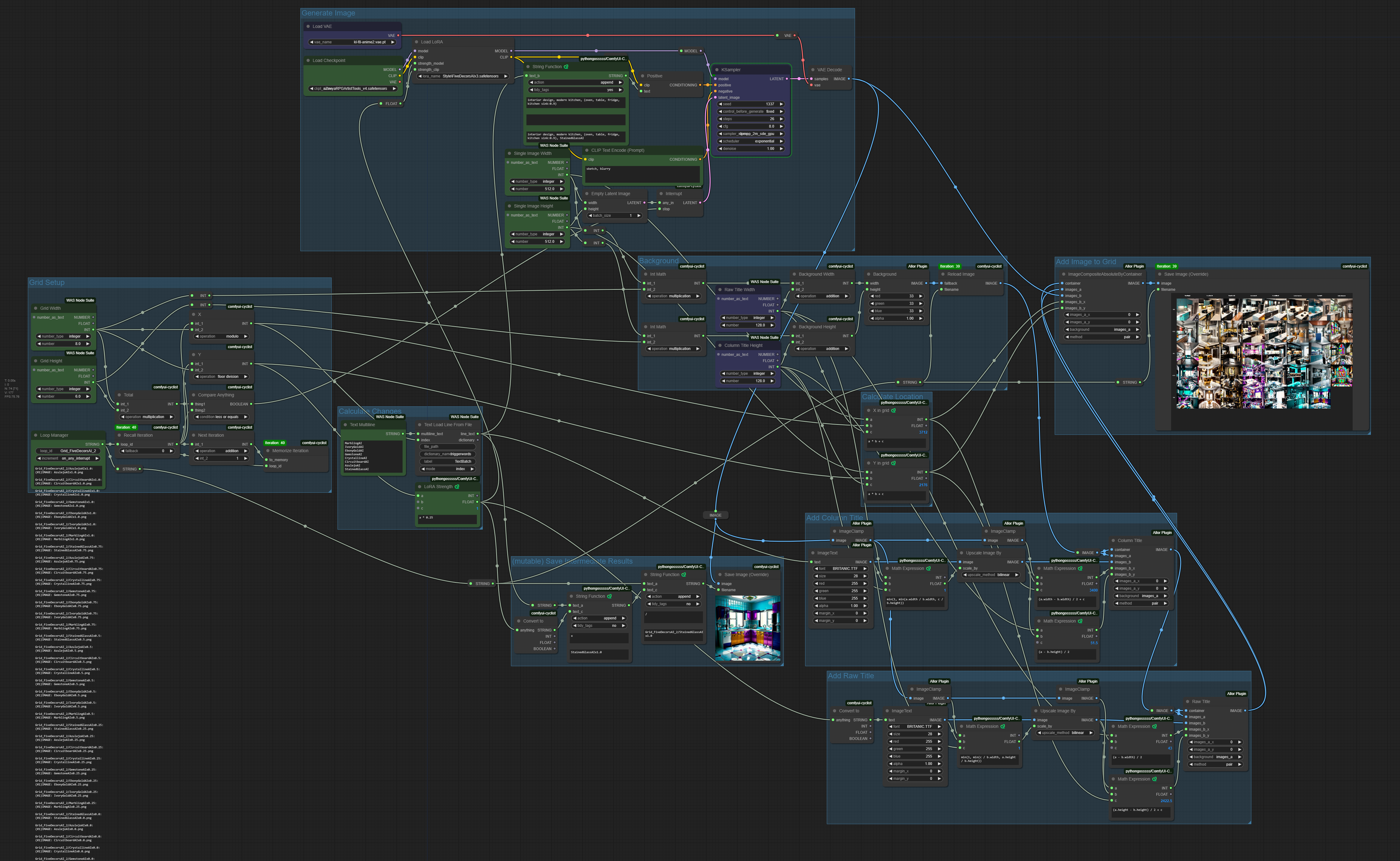 GridTable: standard rectangle grid, with labeled columns and raws. By default, iterates through different keywords of DecorationsBundle LoRA. Uses WAS Node Suite.