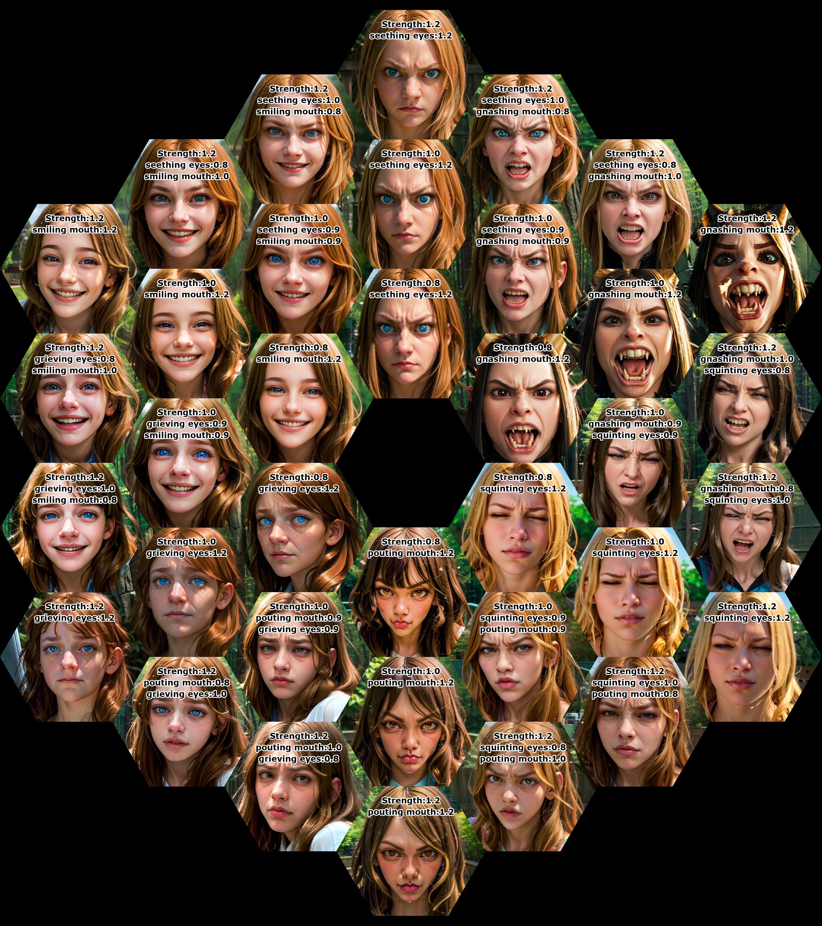 (optional) Change "Calculate Changes" group to handle what rule your images are populated by. The default example is little wild, combinating 2 of 6 keywords for Emotion-Puppeteer-LoRA. You can use more tame upproach, just changing things like CFG/Denoise/LoRA_strength along with q, r and s coordinates. Thus, deleting "Prompt Keyword" group entirely.