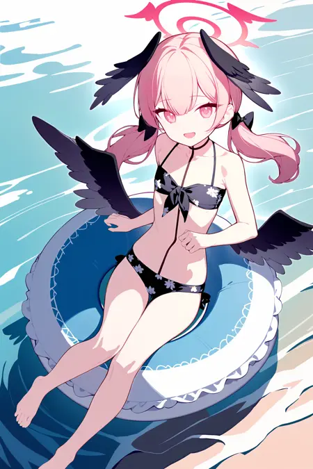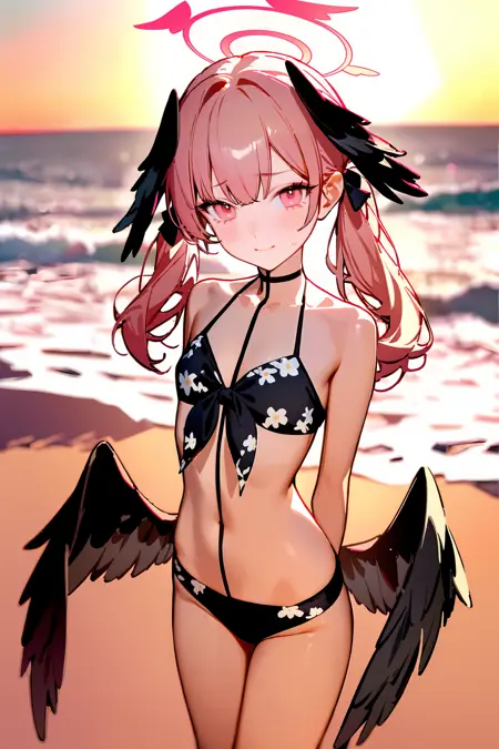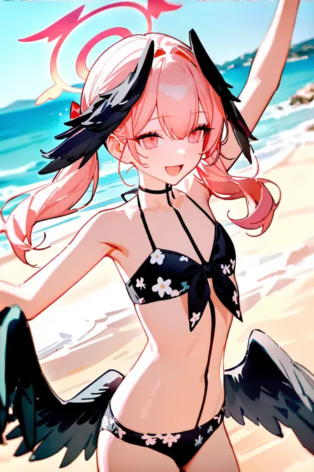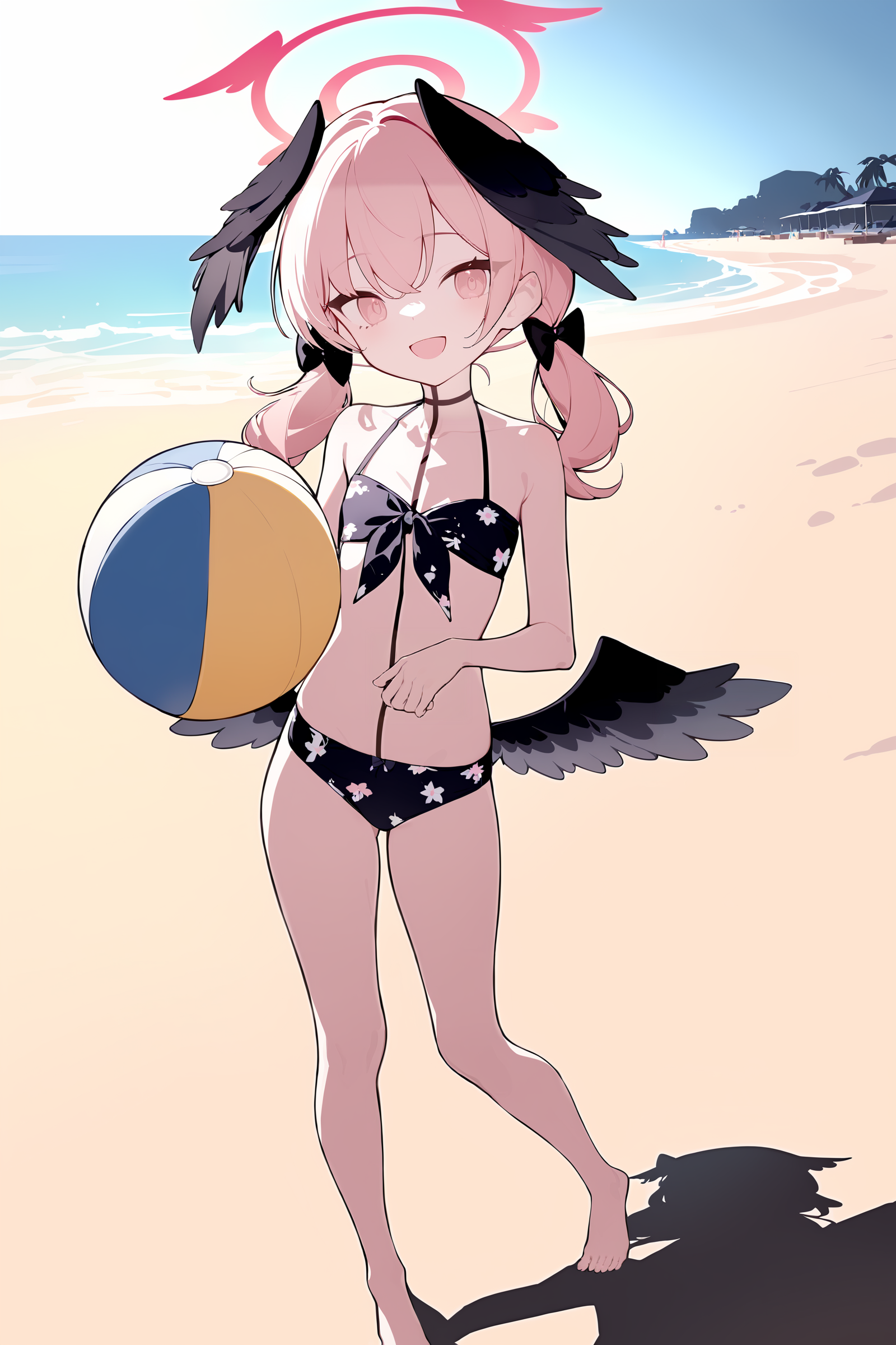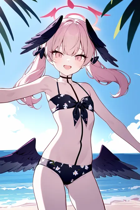 Additional prompts for the new year kimono: twintails, halo, head wings, hair bow, low wings, floral print bikini, barefoot