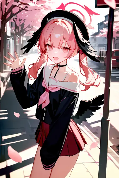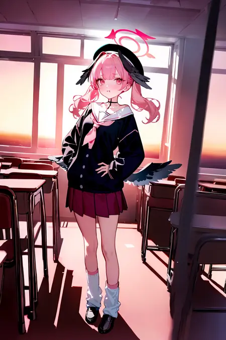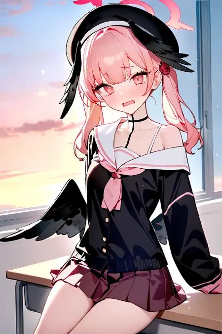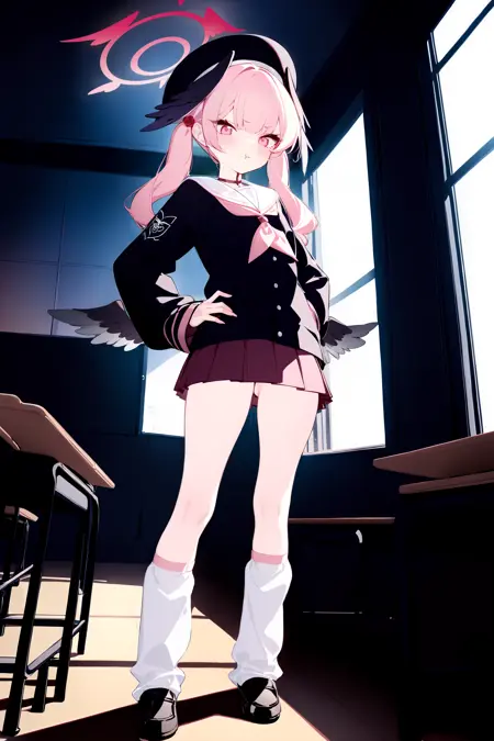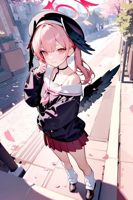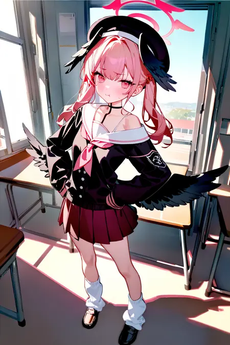 Additional prompts for default costume: twintails, halo, beret, head wings, low wings, pleated miniskirt, sleeves past wrists, sailor shirt, pink neckerchief, off shoulder, loose socks, loafers