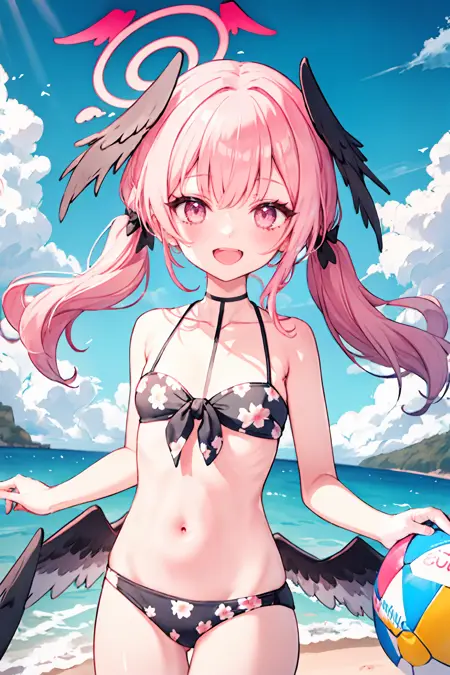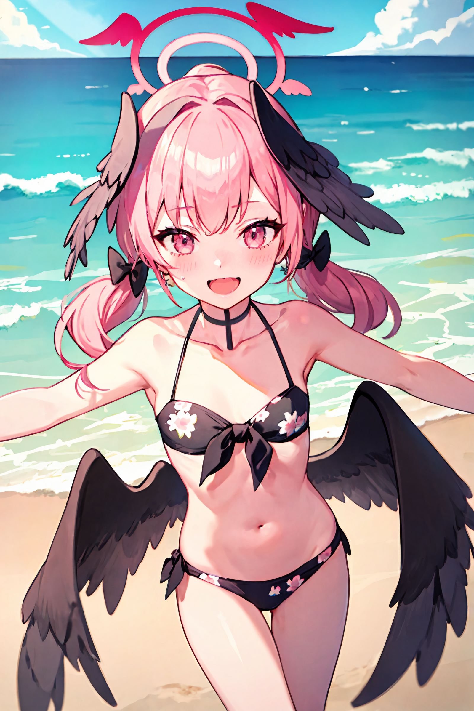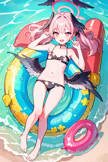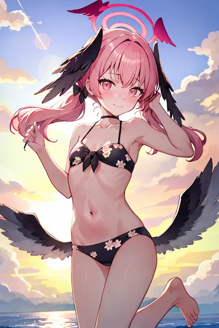 Additional prompts for the new year kimono: twintails, halo, head wings, hair bow, low wings, floral print bikini, barefoot