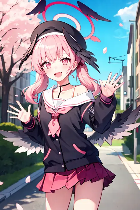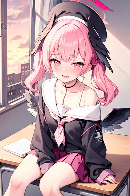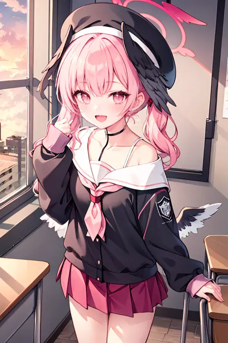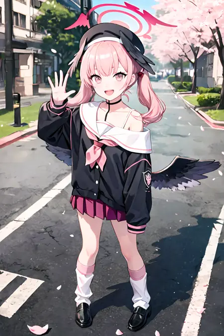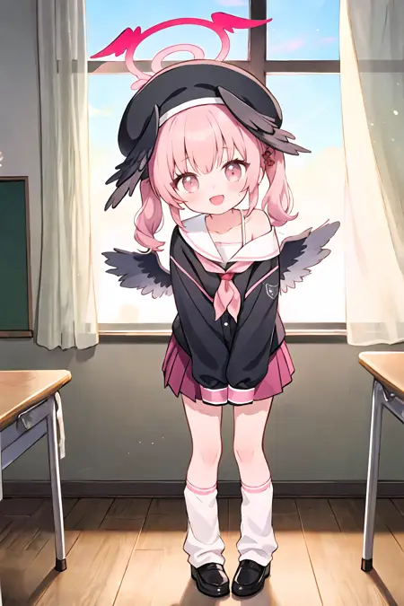 Additional prompts for default costume: twintails, halo, beret, head wings, low wings, pleated miniskirt, sleeves past wrists, sailor shirt, pink neckerchief, off shoulder, loose socks, loafers