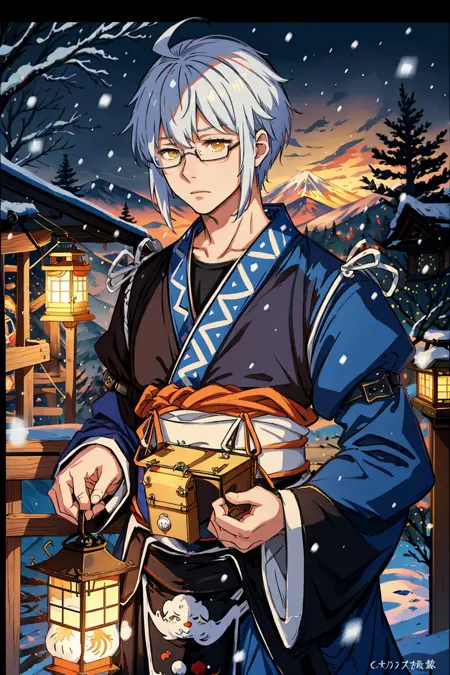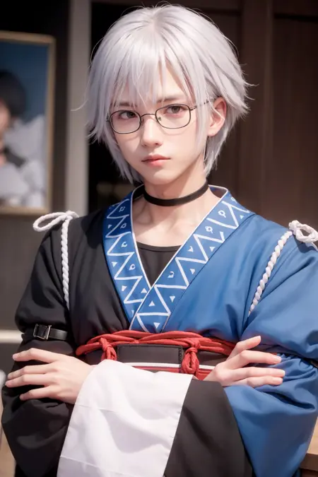 tag:morichika rinnosuke, 1boy, solo, male focus, white hair, short hair, yellow eyes, glasses, choker, japanese clothes, long sleeves, pants, pouch,