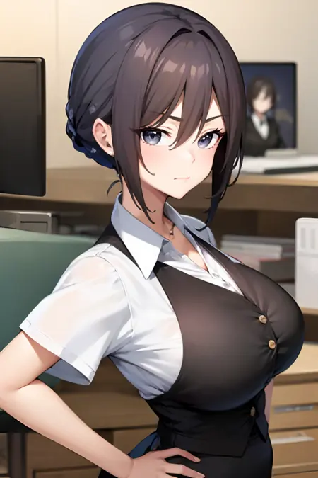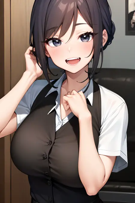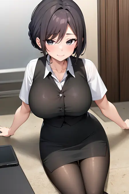 outfit trigger: black vest, short sleeves, white shirt, collared shirt, office lady, miniskirt, pencil skirt, black pantyhose