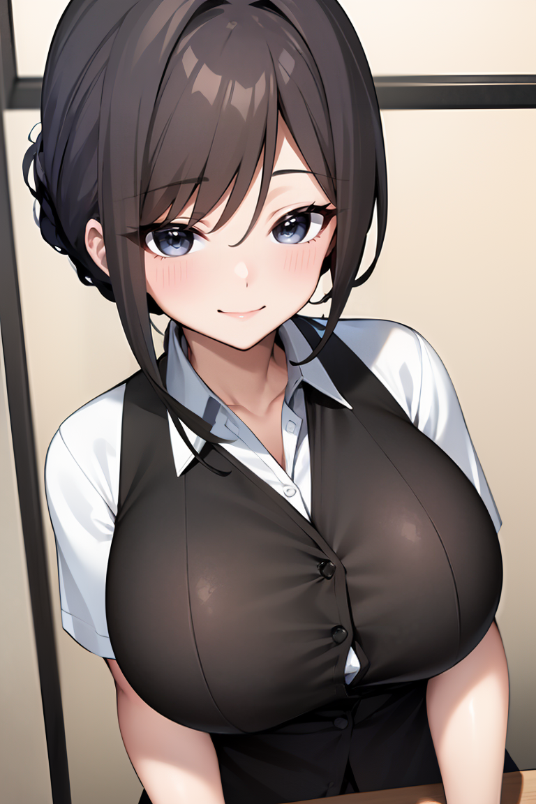 character trigger: black hair, single hair bun, swept bangs, black eyes, large breasts, sidelocks