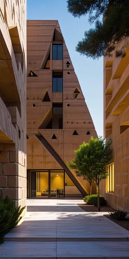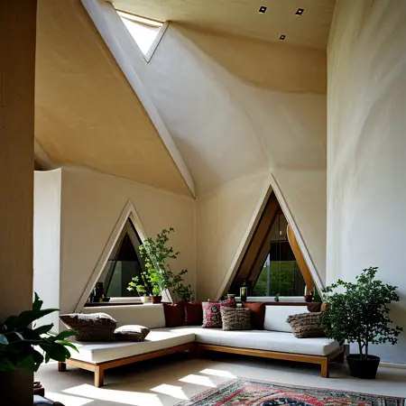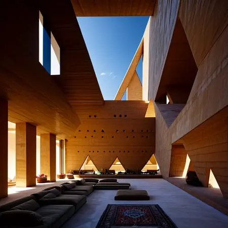 Our new Lora that can generate both exterior scenes and interior spaces defined by bold triangular forms integrated into natural landscapes, as well as warm, angled walls, triangular windows, and earthy textural elements creating a harmonious blend of angular geometry and organic accents.