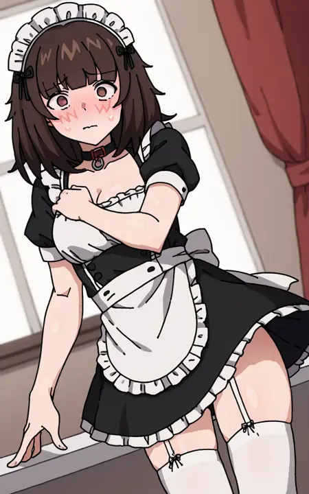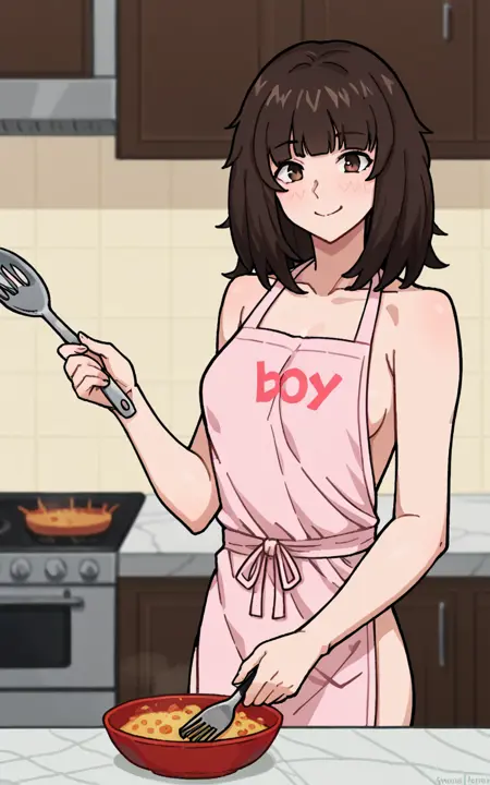 Keyword: boymoder. Additional tags (brown hair, bangs, brown eyes, blush) help make her look more accurate.