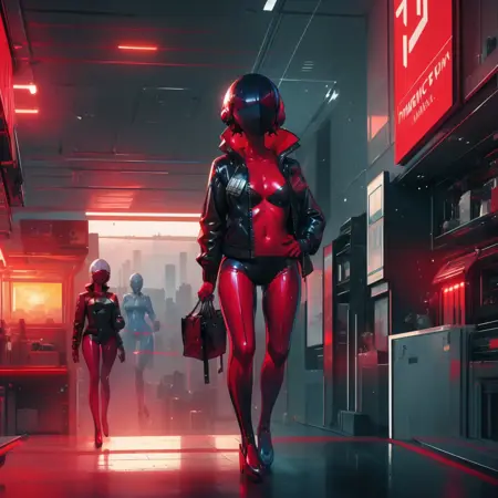 1woman, ((mannequin)) 穿着未来赛博风格服装,在未来城市中,深红色性感背心和黑色皮夹克,无脸,无面部,无头发,无嘴巴,无耳朵,无鼻子,female_solo:1.3, ,SD 1.5,Science fiction