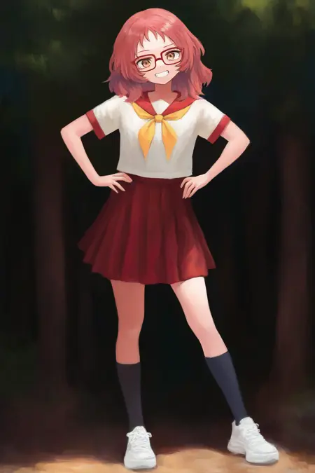 Use Japanese student uniform with red sailor collar and yellow neckercheif, red skirt, black mary jane shoes to summon her clothing, use only what you need to control framing.