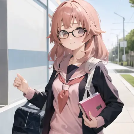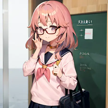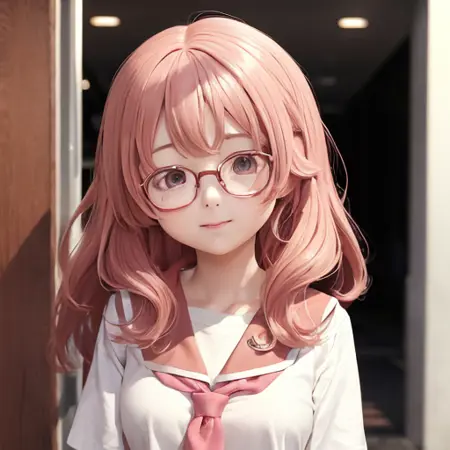 uses ai_mie, pink hair, medium hair to summon her, uses glasses to summon her glasses. put glasses to negative prompt to remove her glasses, Add sailor color, serafuku, school uniform, to summon her outfit, use squinting to squint her eyes, like in the manga.