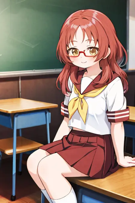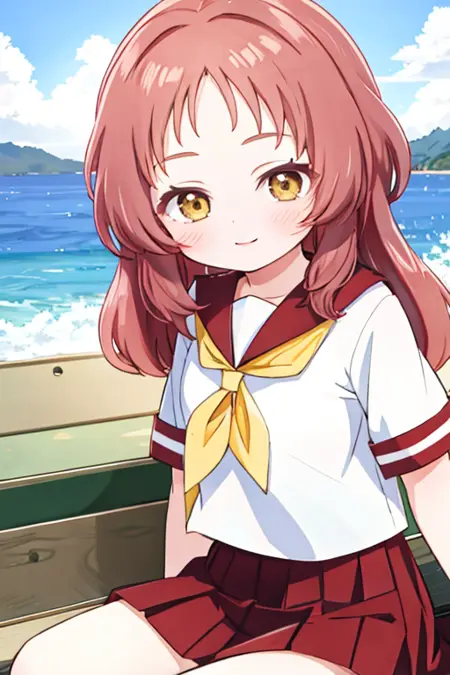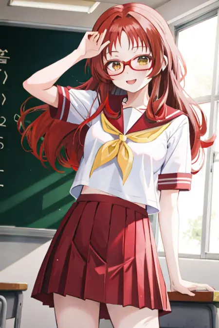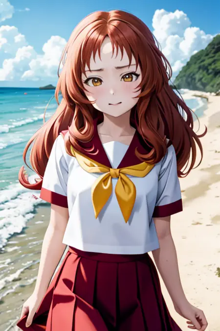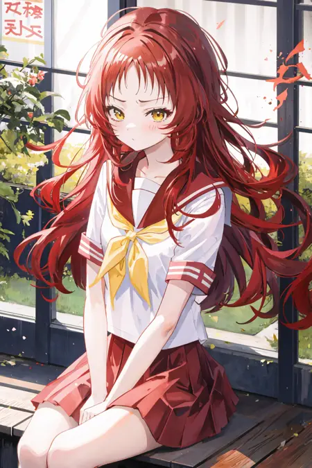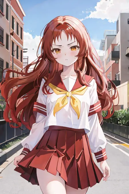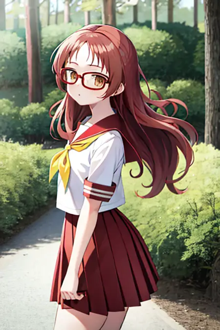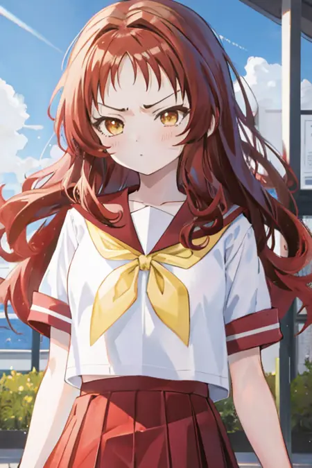 Use Japanese student uniform with red sailor collar and yellow neckercheif, red skirt, black mary jane shoes to summon her clothing, use only what you need to control framing.