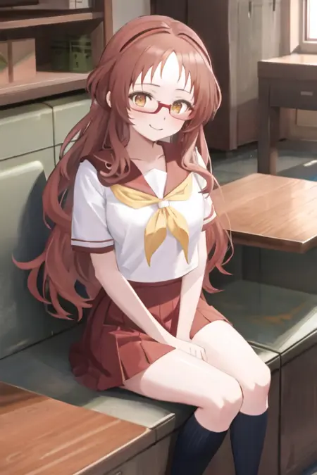 uses ai_mie, pink hair, medium hair to summon her, uses glasses to summon her glasses. put glasses to negative prompt to remove her glasses, Add sailor color, serafuku, school uniform, to summon her outfit, use squinting to squint her eyes, like in the manga.